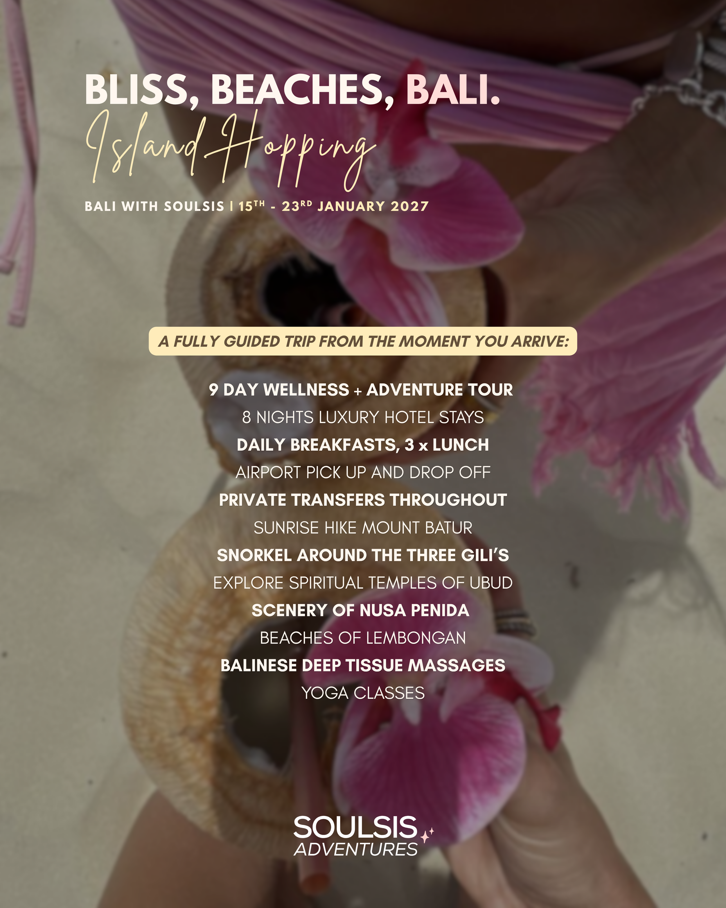“I had such an amazing time with SOULSIS, from the second I booked on Laura was so amazing with keeping me updated on everything and was more than willing to answer my a million questions 😂 Everything was planned perfectly and we had such an amazing time doing every single thing!! All of the girls just clicked straight away and I’ve definitely made lifelong friends 💞”